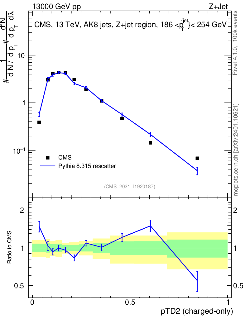 Lines: data, pythia8 8.315 rescatter |
