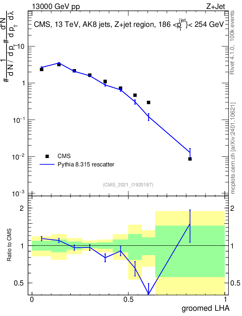 Lines: data, pythia8 8.315 rescatter |