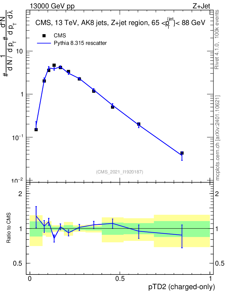 Lines: data, pythia8 8.315 rescatter |