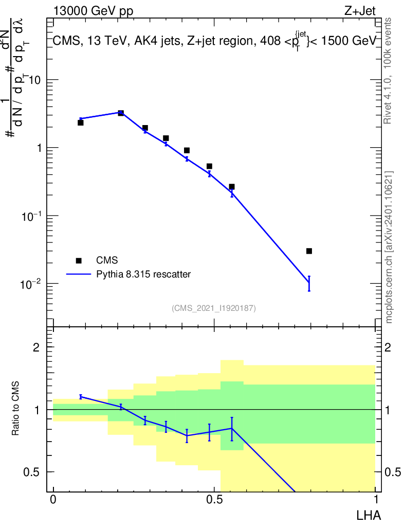 Lines: data, pythia8 8.315 rescatter |