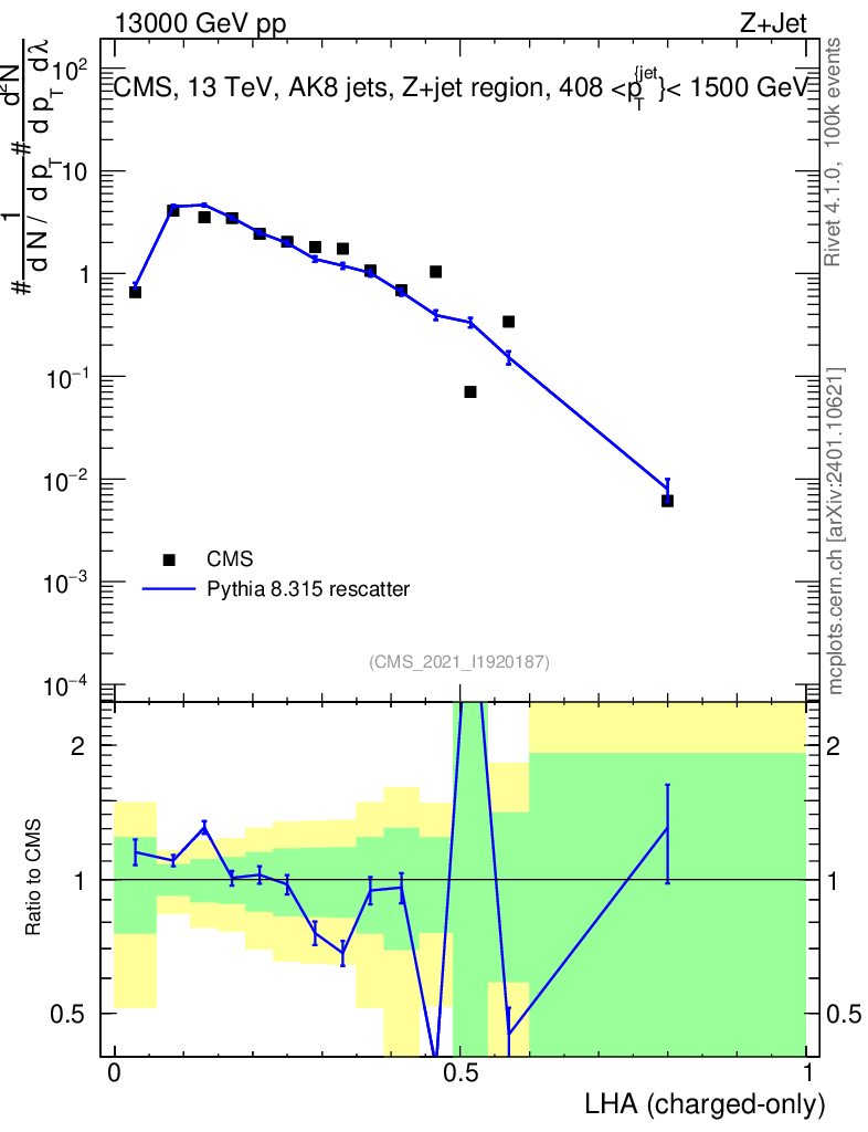 Lines: data, pythia8 8.315 rescatter |