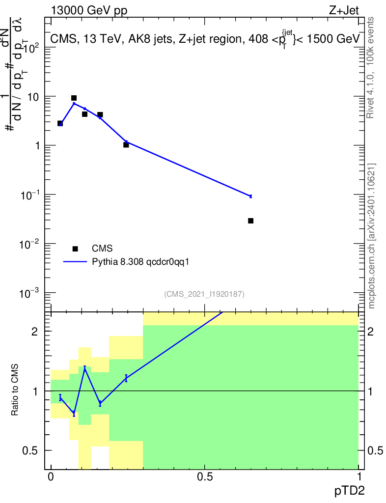 Lines: data, pythia8 8.308 qcdcr0qq1 |