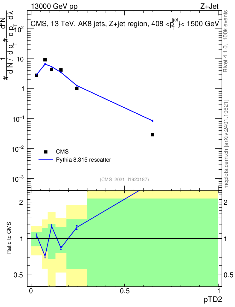 Lines: data, pythia8 8.315 rescatter |