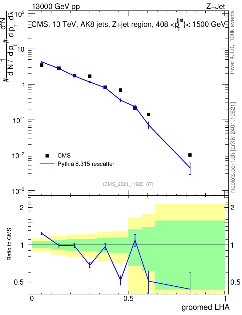 Lines: data, pythia8 8.315 rescatter |