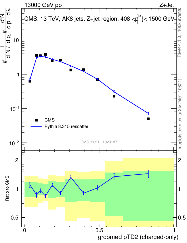 Lines: data, pythia8 8.315 rescatter |