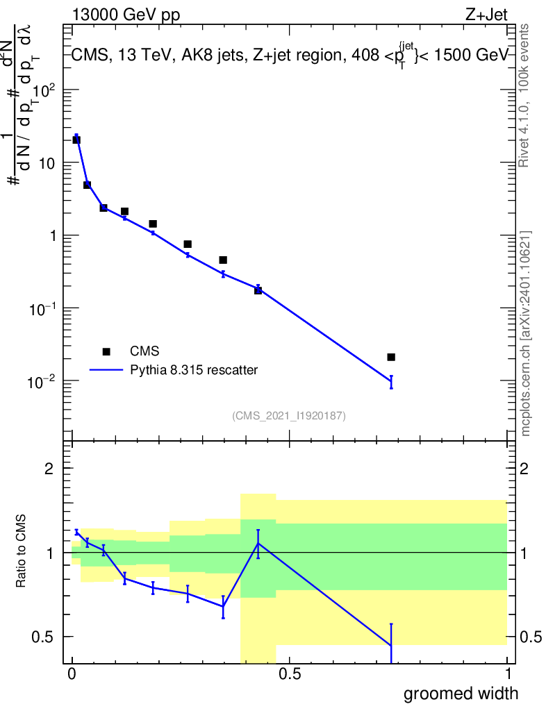Lines: data, pythia8 8.315 rescatter |