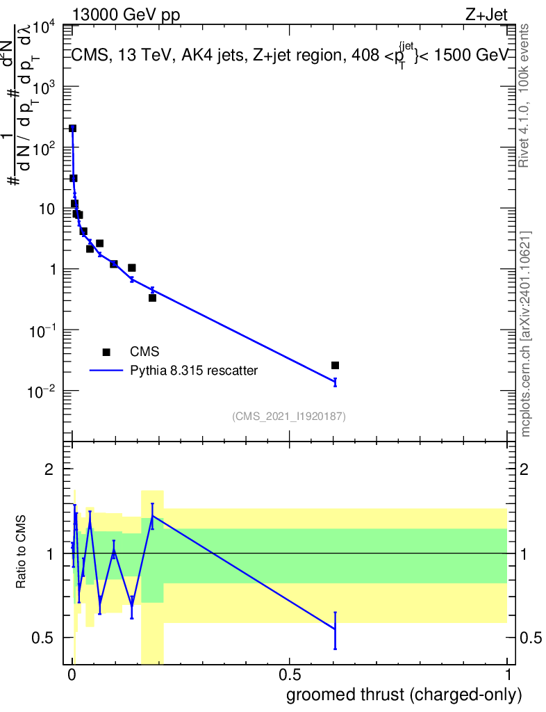 Lines: data, pythia8 8.315 rescatter |