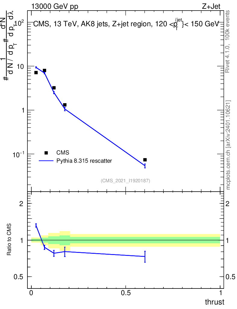 Lines: data, pythia8 8.315 rescatter |
