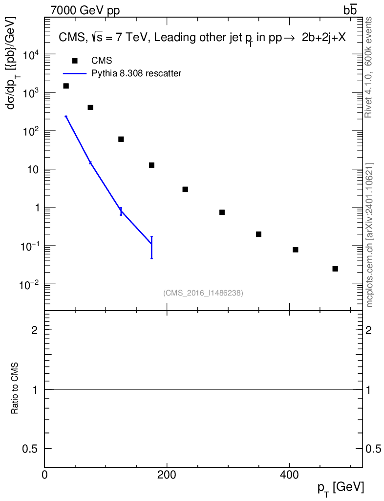 Lines: data, pythia8 8.308 rescatter | compare with other tunes