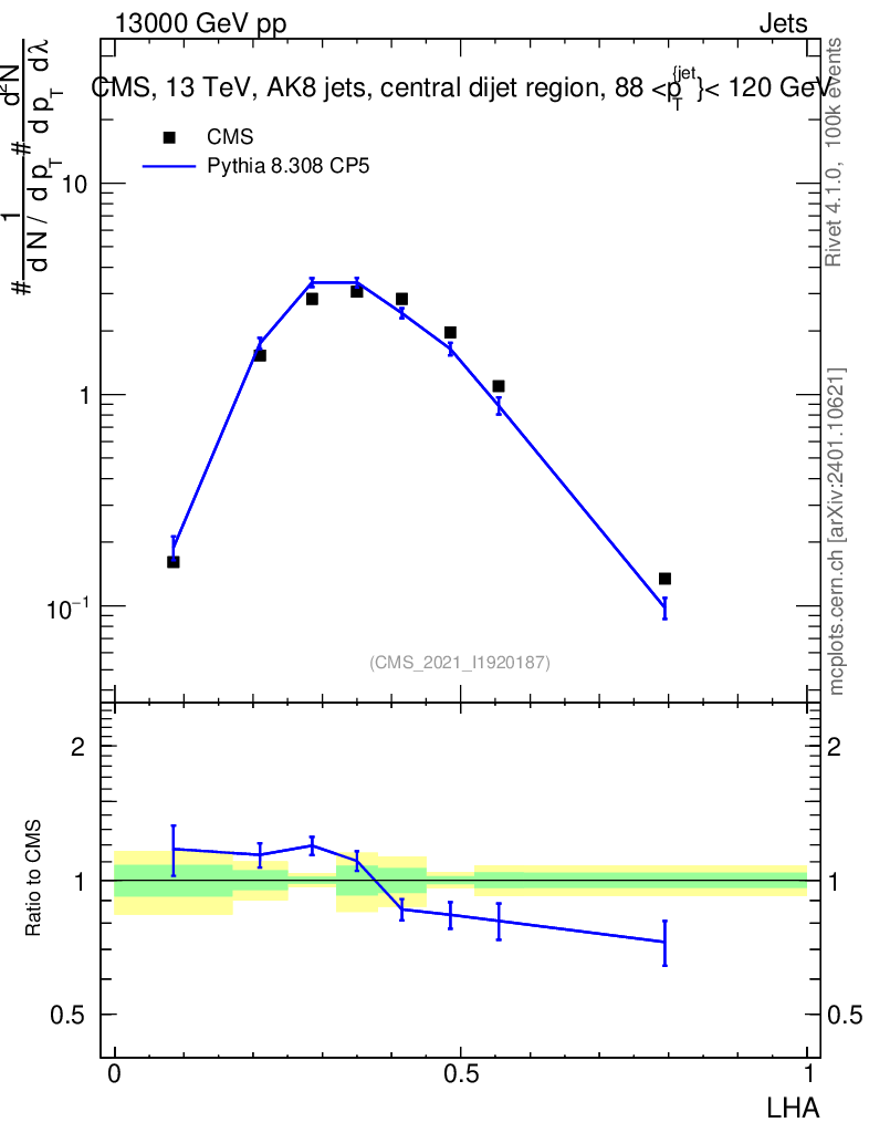 Lines: data, pythia8 8.308 CP5 |