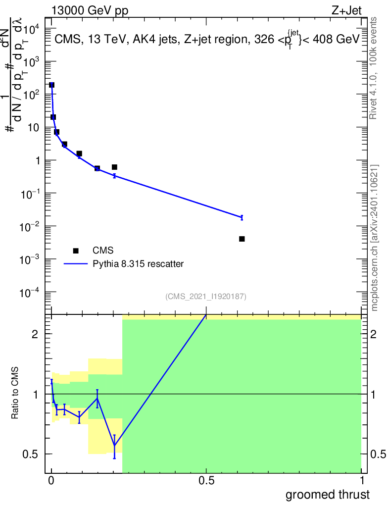 Lines: data, pythia8 8.315 rescatter |