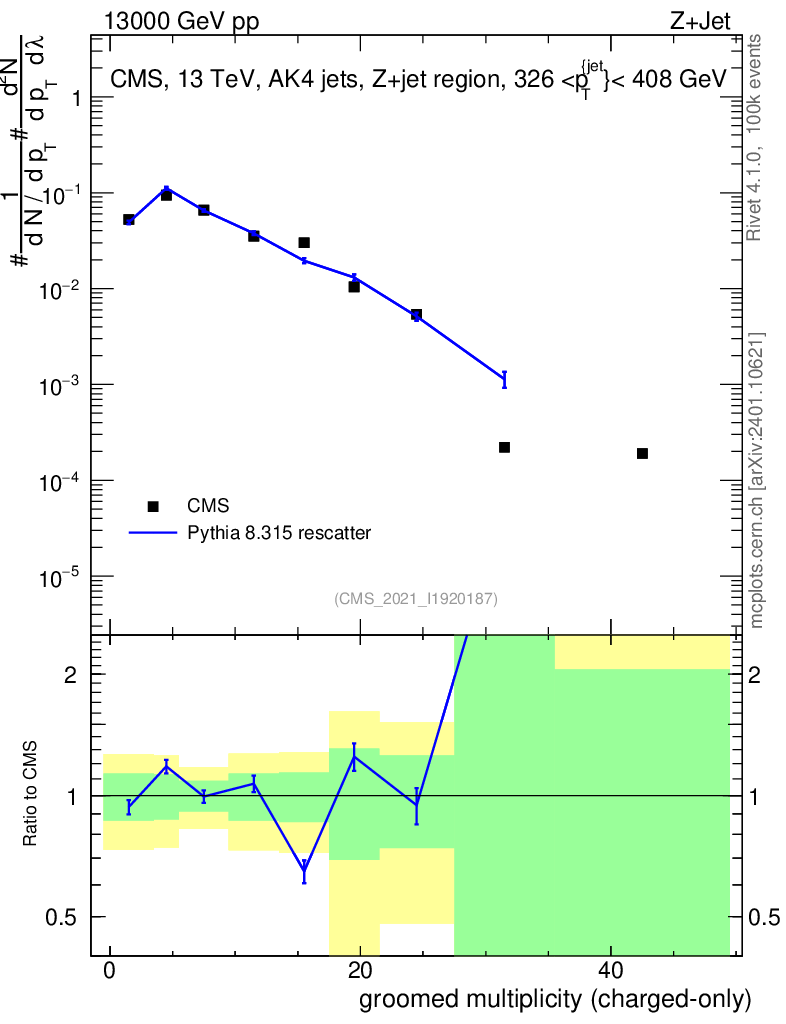 Lines: data, pythia8 8.315 rescatter |