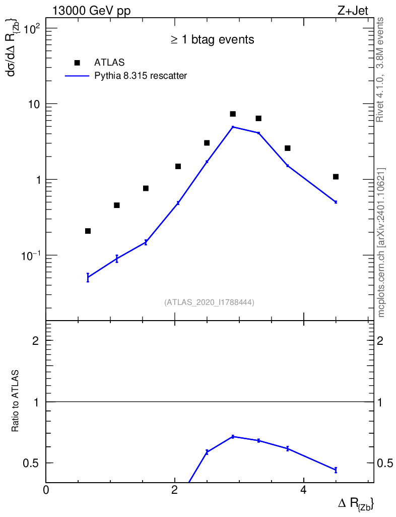 Lines: data, pythia8 8.315 rescatter |