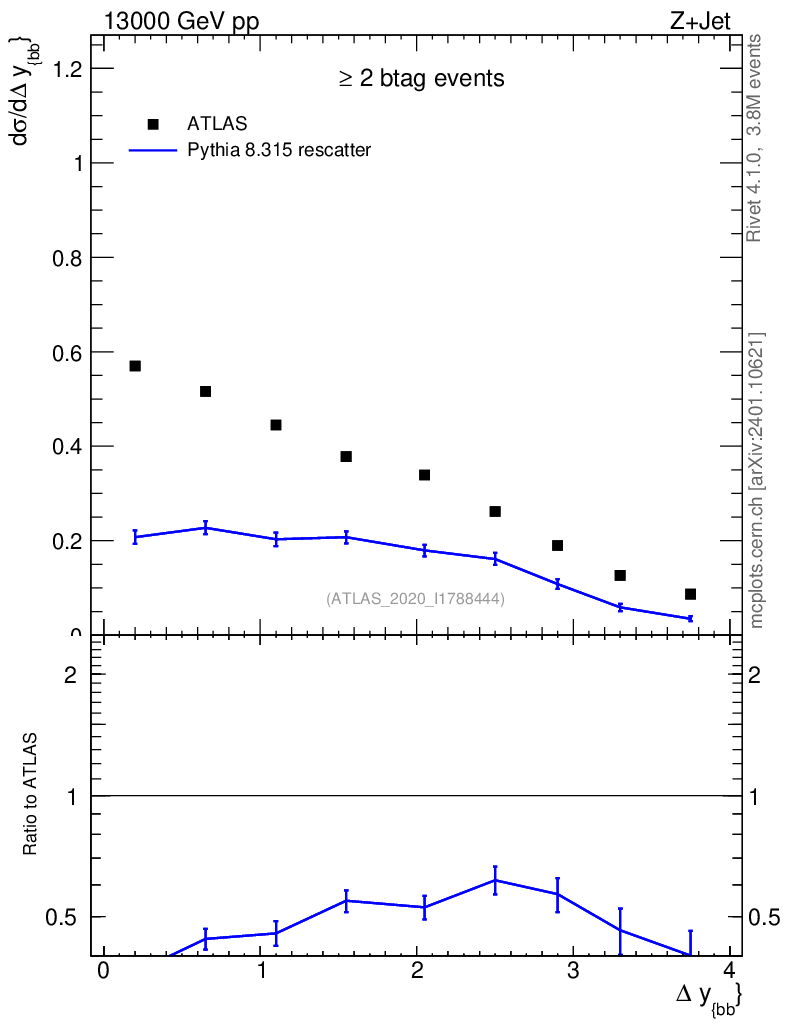 Lines: data, pythia8 8.315 rescatter |