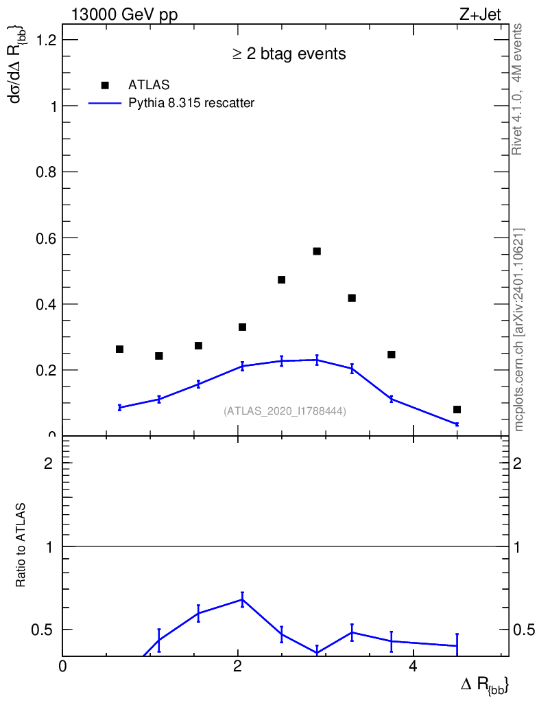 Lines: data, pythia8 8.315 rescatter |