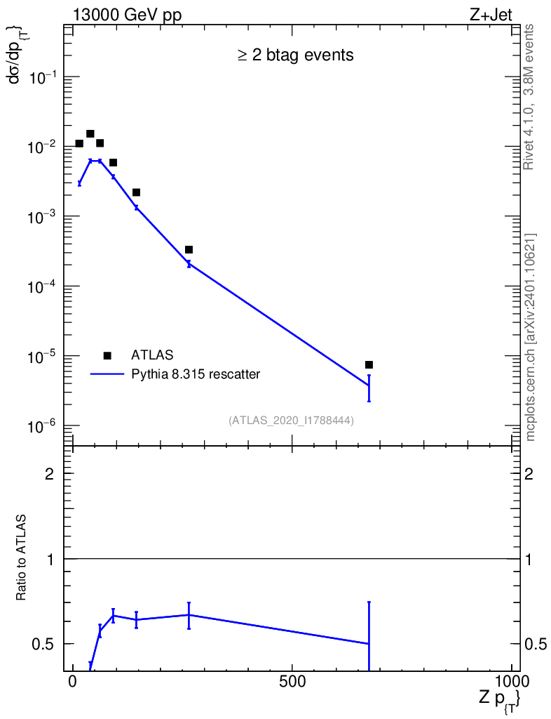 Lines: data, pythia8 8.315 rescatter |