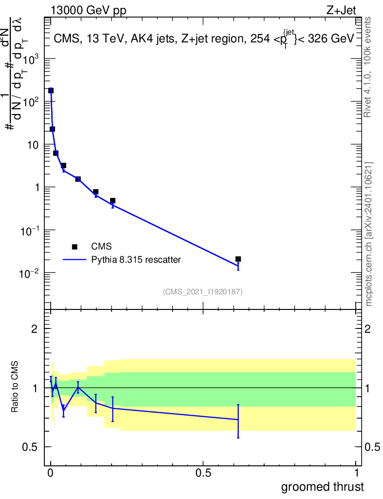 Lines: data, pythia8 8.315 rescatter |