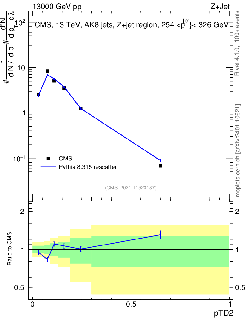 Lines: data, pythia8 8.315 rescatter |