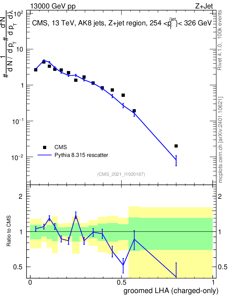 Lines: data, pythia8 8.315 rescatter |