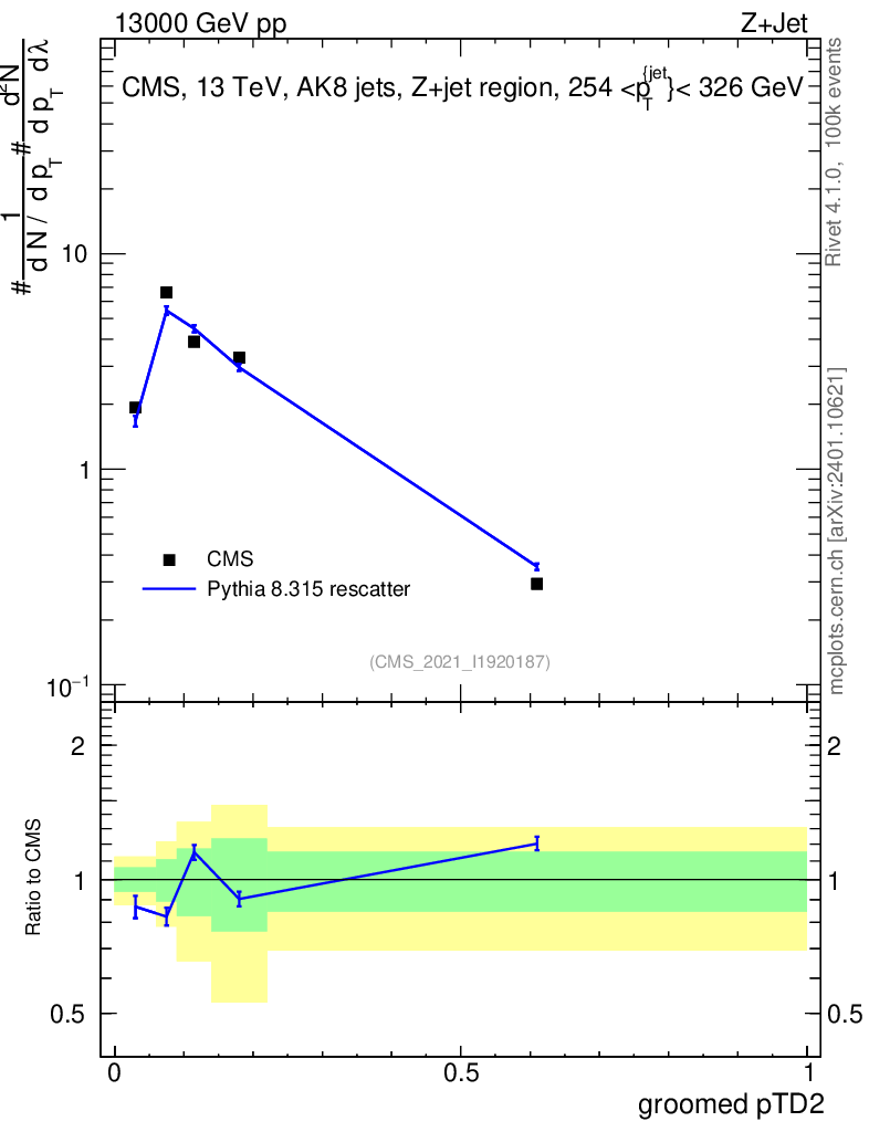 Lines: data, pythia8 8.315 rescatter |