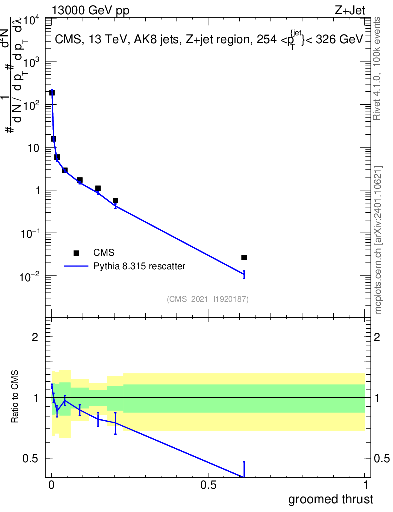 Lines: data, pythia8 8.315 rescatter |