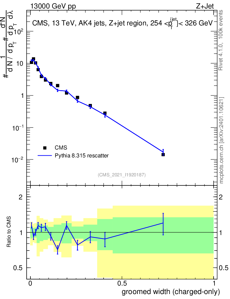 Lines: data, pythia8 8.315 rescatter |