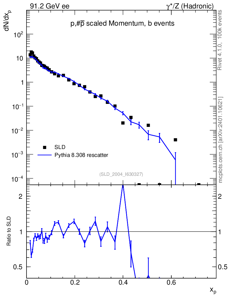 Lines: data, pythia8 8.308 rescatter |