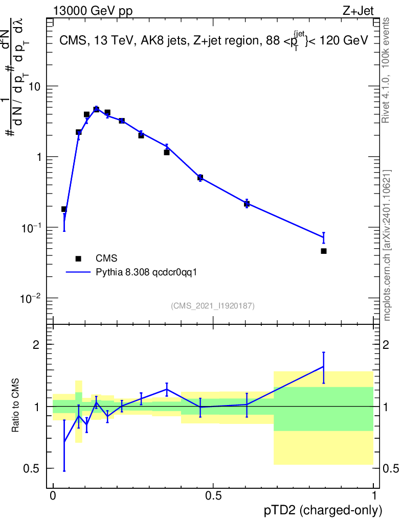 Lines: data, pythia8 8.308 qcdcr0qq1 |