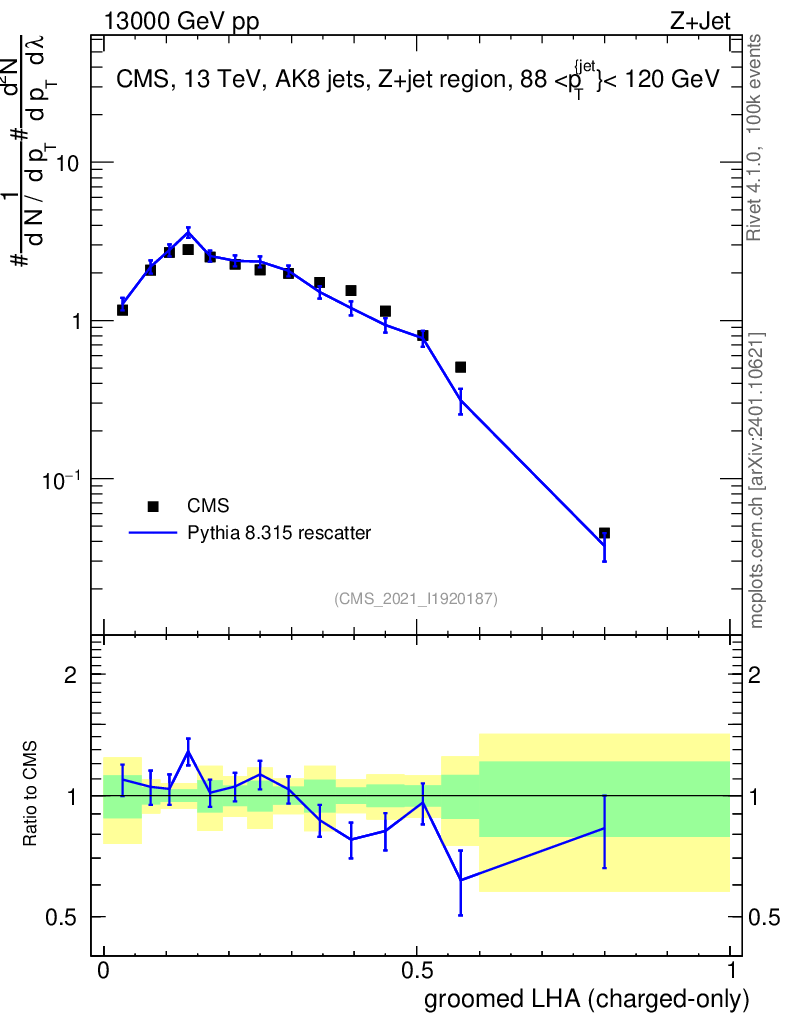 Lines: data, pythia8 8.315 rescatter |