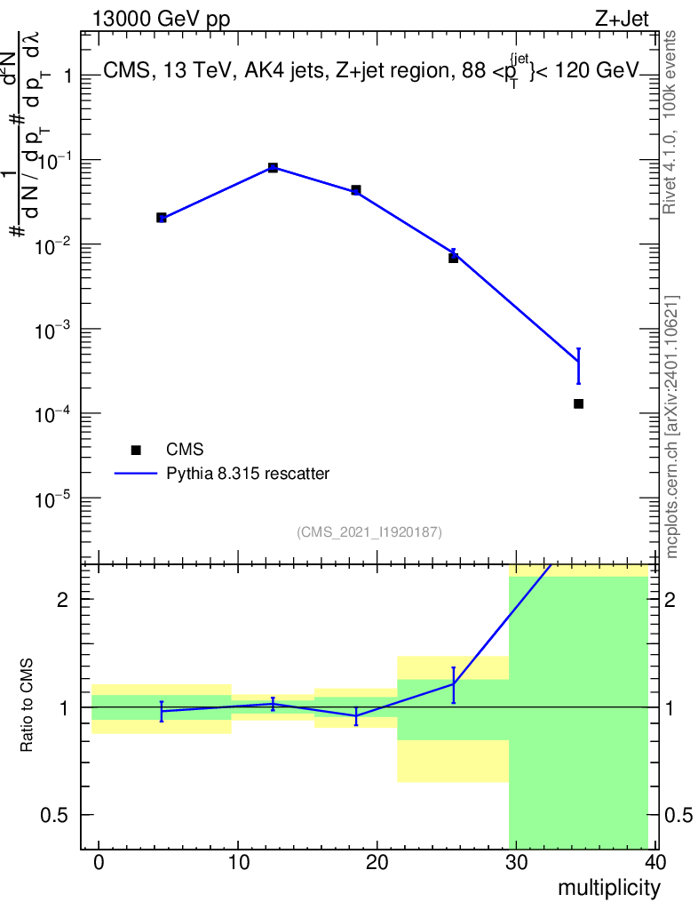 Lines: data, pythia8 8.315 rescatter |