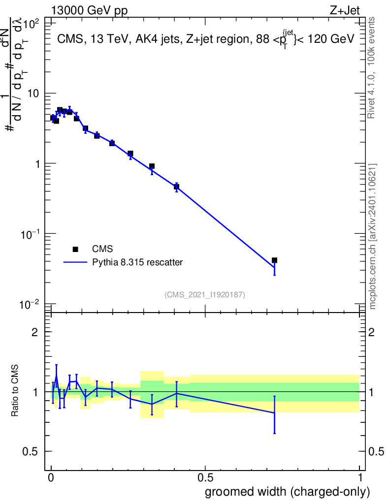 Lines: data, pythia8 8.315 rescatter |