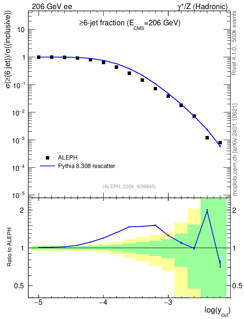Lines: data, pythia8 8.308 rescatter | compare with other tunes