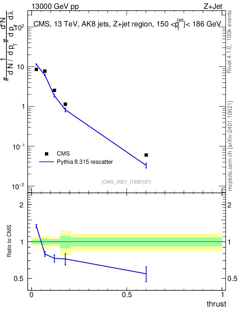Lines: data, pythia8 8.315 rescatter |