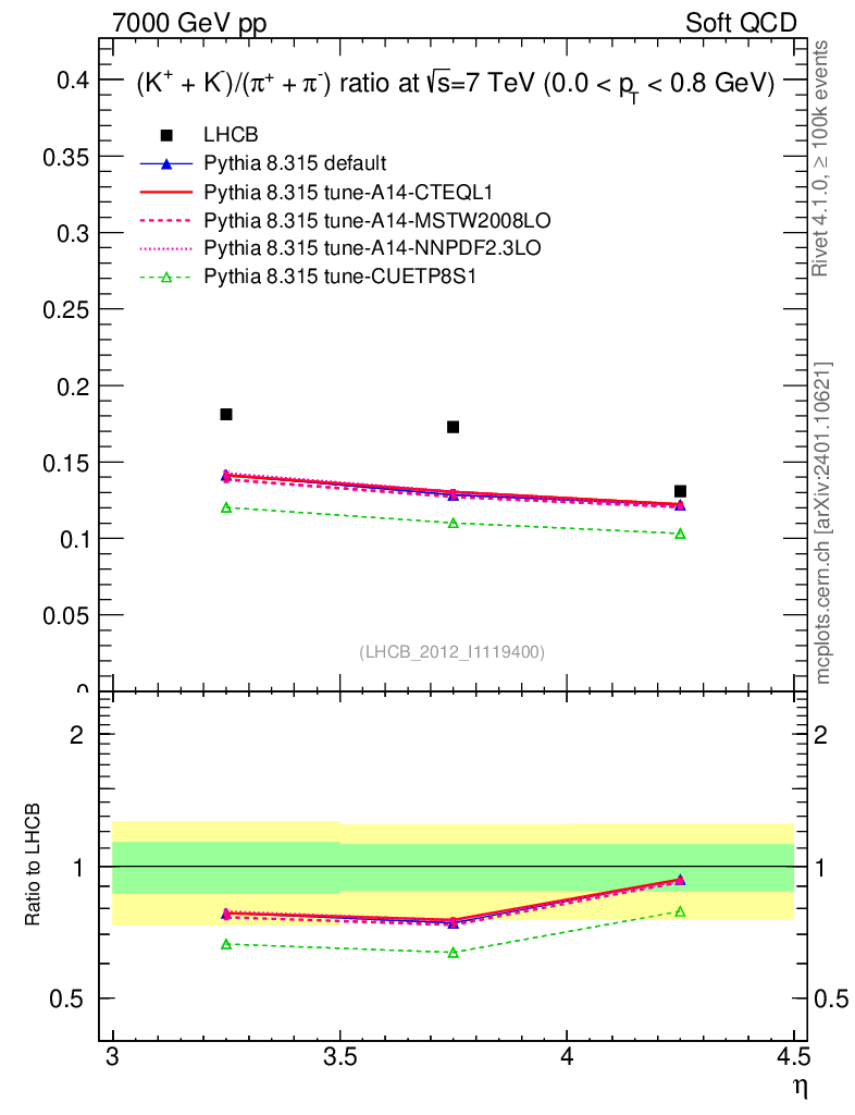 Soft QCD (inelastic) : Identified Particles : Ratios : (K-+K+)/(π-+π+) vs |y|