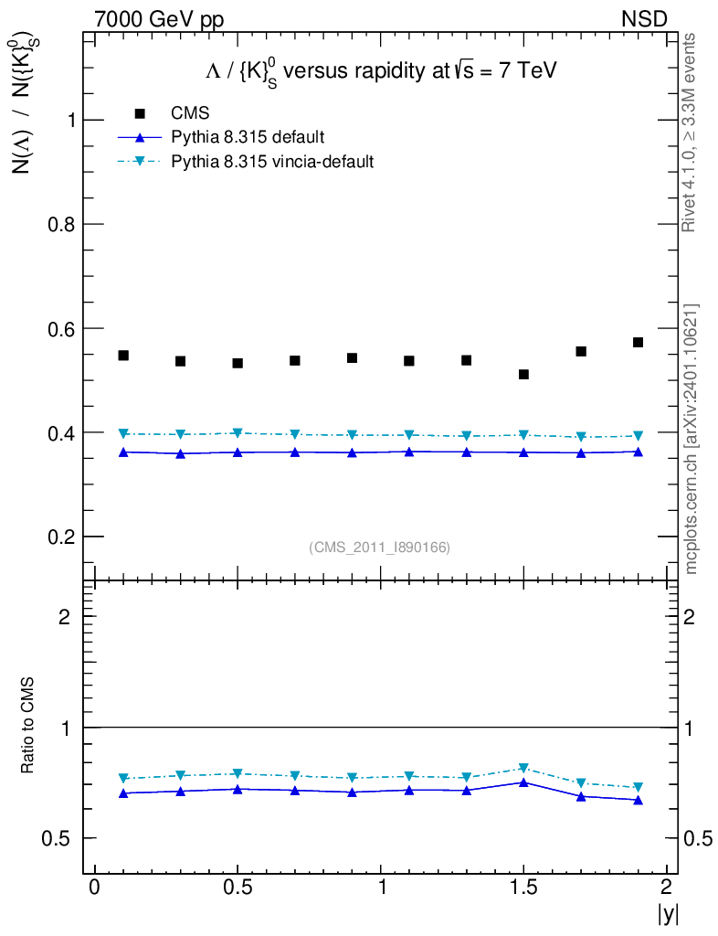 Soft QCD (nsd only) : Identified Particles : Ratios : Λ/K0S vs |y|