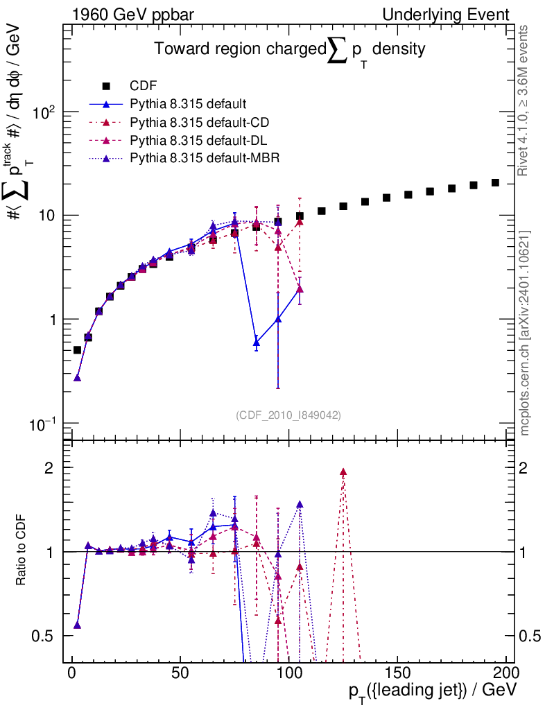 Plot of sumpt-vs-pt-twrd in 1960 GeV ppbar collisions